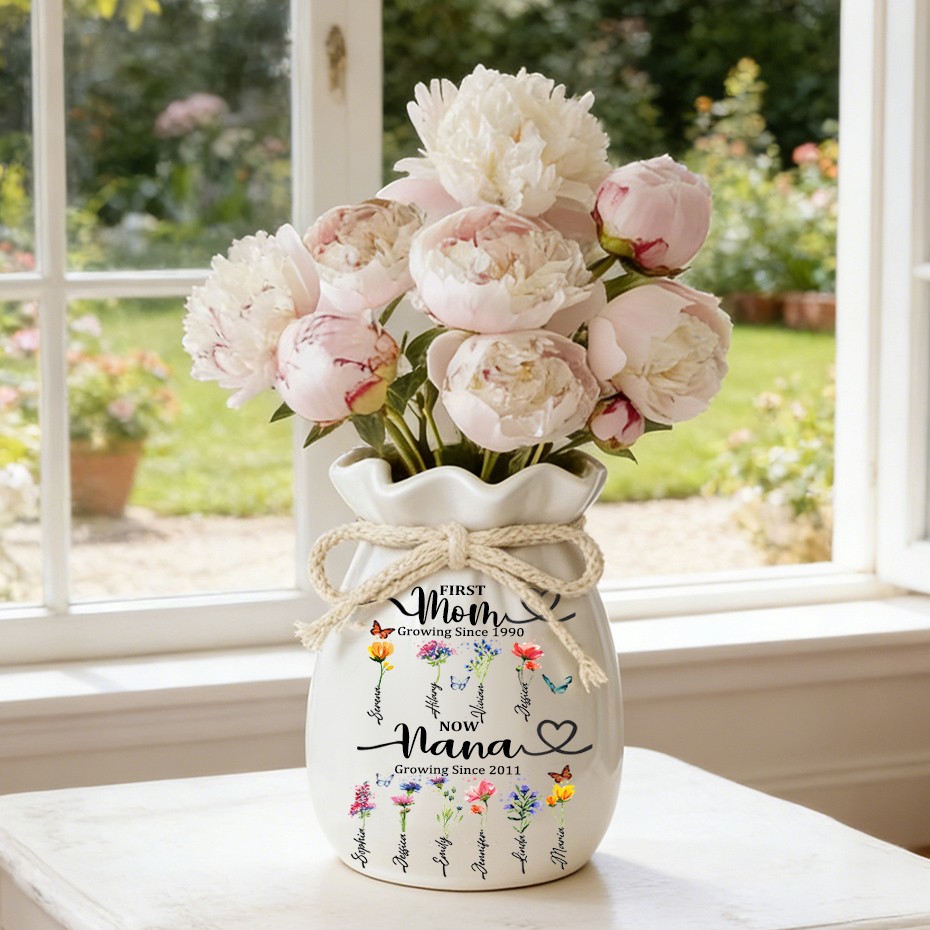 Custom Family Garden Birth Flower Vase With Grandchildren Name For Mother's Day Gift