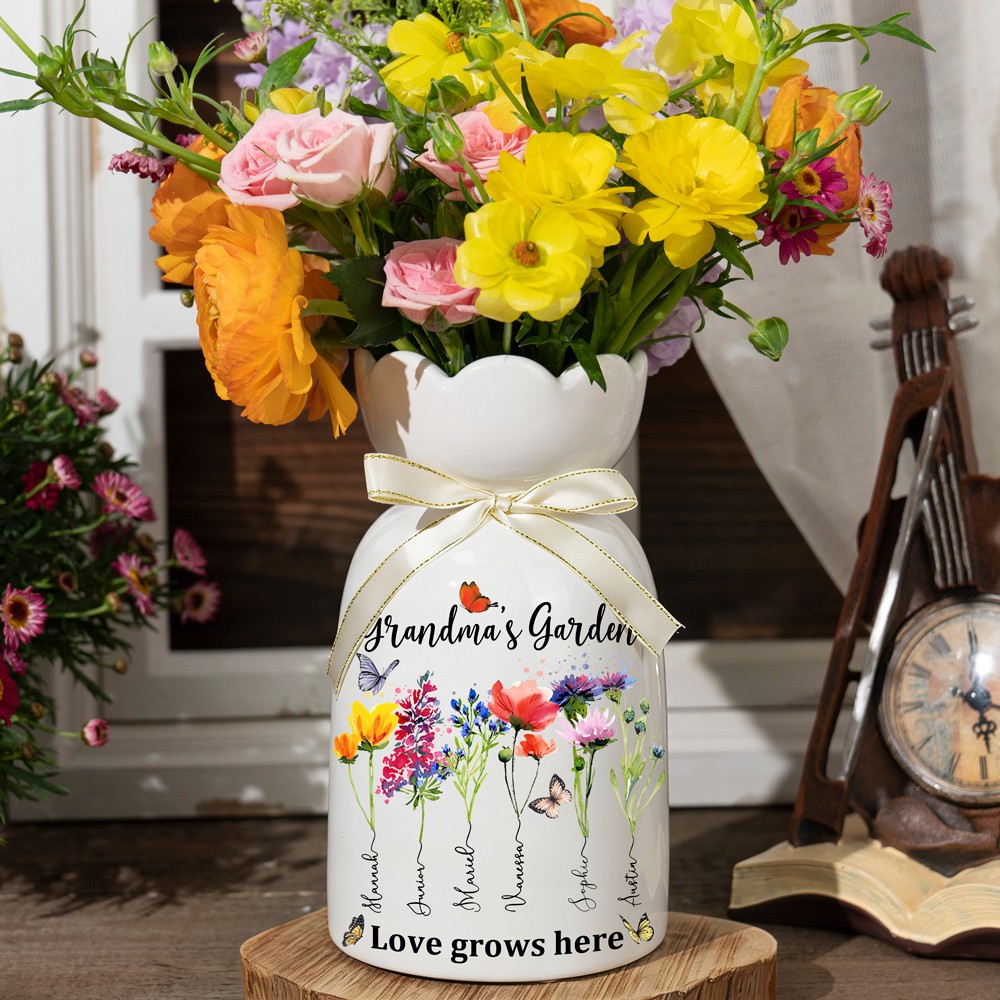 Custom Family Garden Birth Flower Vase With Grandchildren Name For Mother's Day Gift